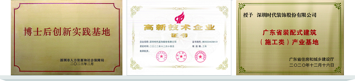 公司在科研創(chuàng)新的持續(xù)投入,取得了逐年倍增的豐碩成果。公司被認定為“國家級高新技術(shù)企業(yè)”、“深圳市博士后創(chuàng)新實踐基地”。知識產(chǎn)權(quán)方面,截至2022年12月31日,公司擁有發(fā)明專利17個(其中建筑科技8個),實用新型專利211個(包含建筑科技39個),已獲取的軟件著作權(quán)證書共78件(含建筑科技50件)。2020年,公司承建項目“華潤總部大廈之美術(shù)館、會議發(fā)布廳、展示中心精裝修分包工程”榮獲2019年度建筑裝飾行業(yè)科學(xué)技術(shù)將—科技創(chuàng)新工程獎、自主研發(fā)的“裝配式內(nèi)裝技術(shù)系統(tǒng)”榮獲2020年度建筑裝飾行業(yè)科學(xué)技術(shù)獎—科技創(chuàng)新成果獎;同年,時代裝飾獲評為“廣東省建筑裝配式產(chǎn)業(yè)基地”,是行業(yè)內(nèi)唯一一家既被評為“市 級裝配式建筑產(chǎn)業(yè)基地”又獲評為“省級裝配式建筑產(chǎn)業(yè)基地”的企業(yè)。此外,由我司與時代建筑科技聯(lián)合研發(fā)并申報的課題“裝配式內(nèi)裝技術(shù)體系研發(fā)與產(chǎn)業(yè)化應(yīng)用”成功列入“深圳市2021年工程建設(shè)領(lǐng)域科技計劃項目”、“廣東省住房和城鄉(xiāng)建設(shè)廳2021年科技創(chuàng)新計劃項目”。