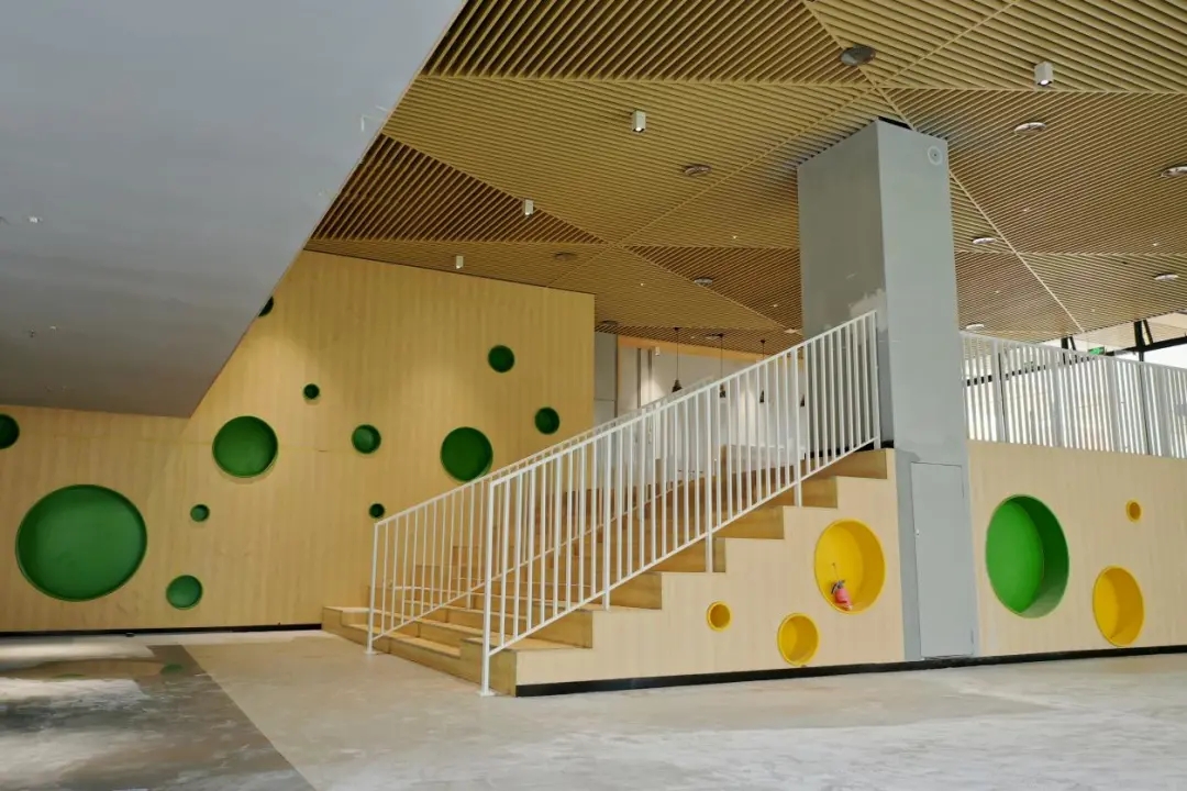 時(shí)代裝飾承建該項(xiàng)目的室內(nèi)裝飾工程,始終把孩子們的健康與舒適放在首位,摒棄傳統(tǒng)膠粘、濕作業(yè),積極采用干式工法,采用裝配式藝術(shù)吊頂、干掛吸音裝飾墻板及架空地板等工藝,從源頭降低室內(nèi)空氣污染,并保證良好的吸音隔音效果,為孩子們創(chuàng)造了一個(gè)潔凈、安全、舒適、健康的成長(zhǎng)環(huán)境。