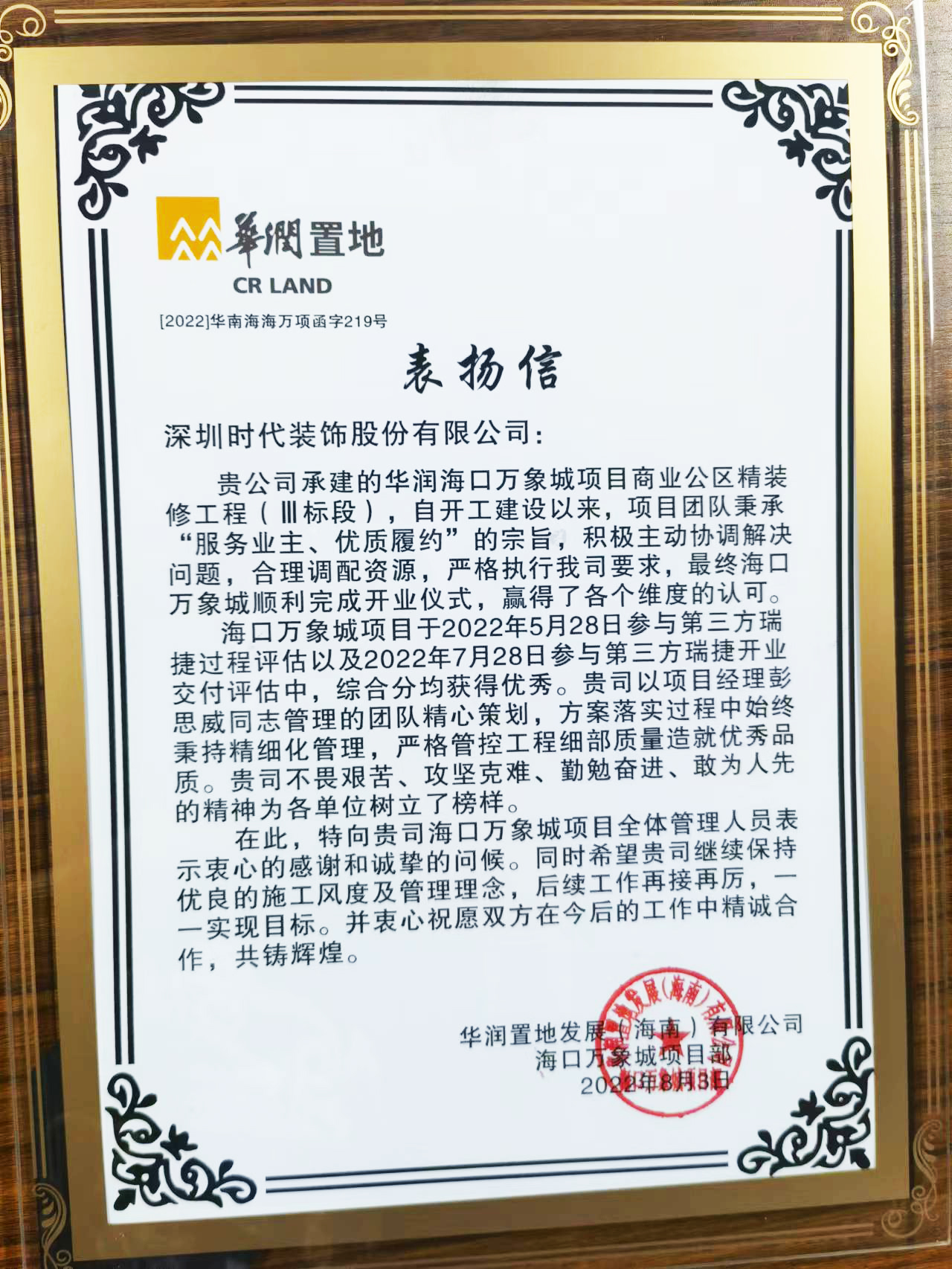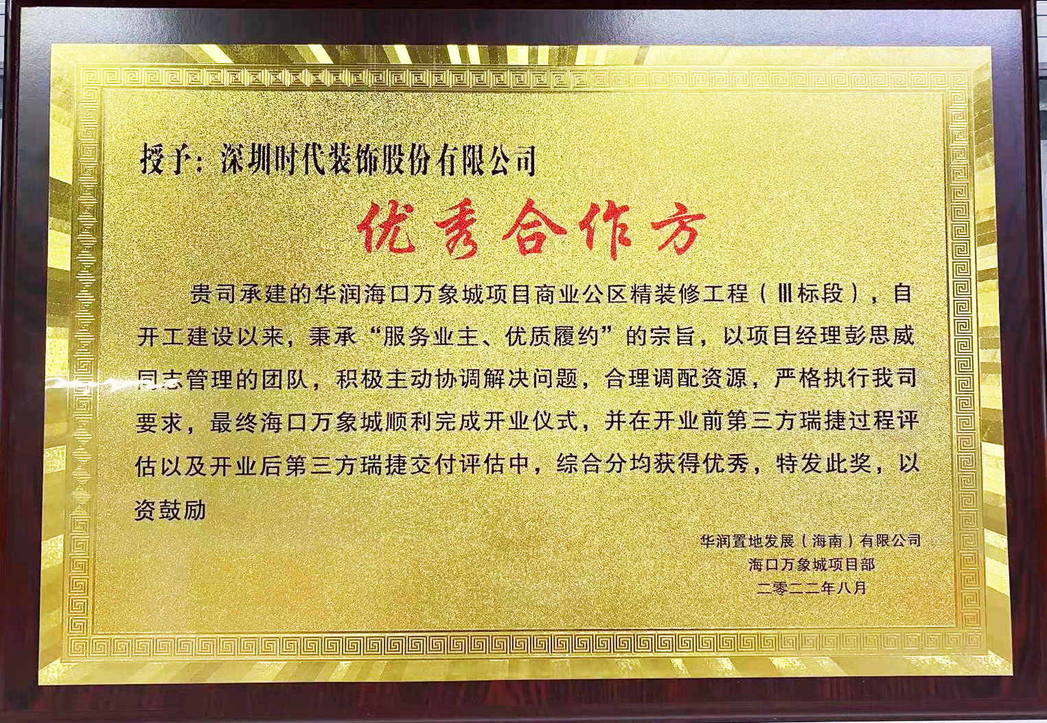 2022年6月26日,海口萬象城于??谑袊Q(mào) CBD 核心區(qū)域非凡啟程,是海南第一個集頂級商業(yè),高端住宅,商務(wù)辦公于一體的城市地標(biāo)綜合體項目。項目順應(yīng)國家“海南自由貿(mào)易港”發(fā)展方向,通過大量波浪金屬板與石材的裝飾應(yīng)用,在室內(nèi)空間中將海洋島嶼概念貫徹到底。履約過程中,時代團(tuán)隊秉承“服務(wù)業(yè)主、優(yōu)質(zhì)履約”的宗旨,以主動高效的態(tài)度和品質(zhì)嚴(yán)控的標(biāo)準(zhǔn),造就海南商業(yè)新地標(biāo),在第三方瑞捷過程評估以及開業(yè)交付評估中綜合分均獲得優(yōu)秀,贏得各個維度認(rèn)可!
