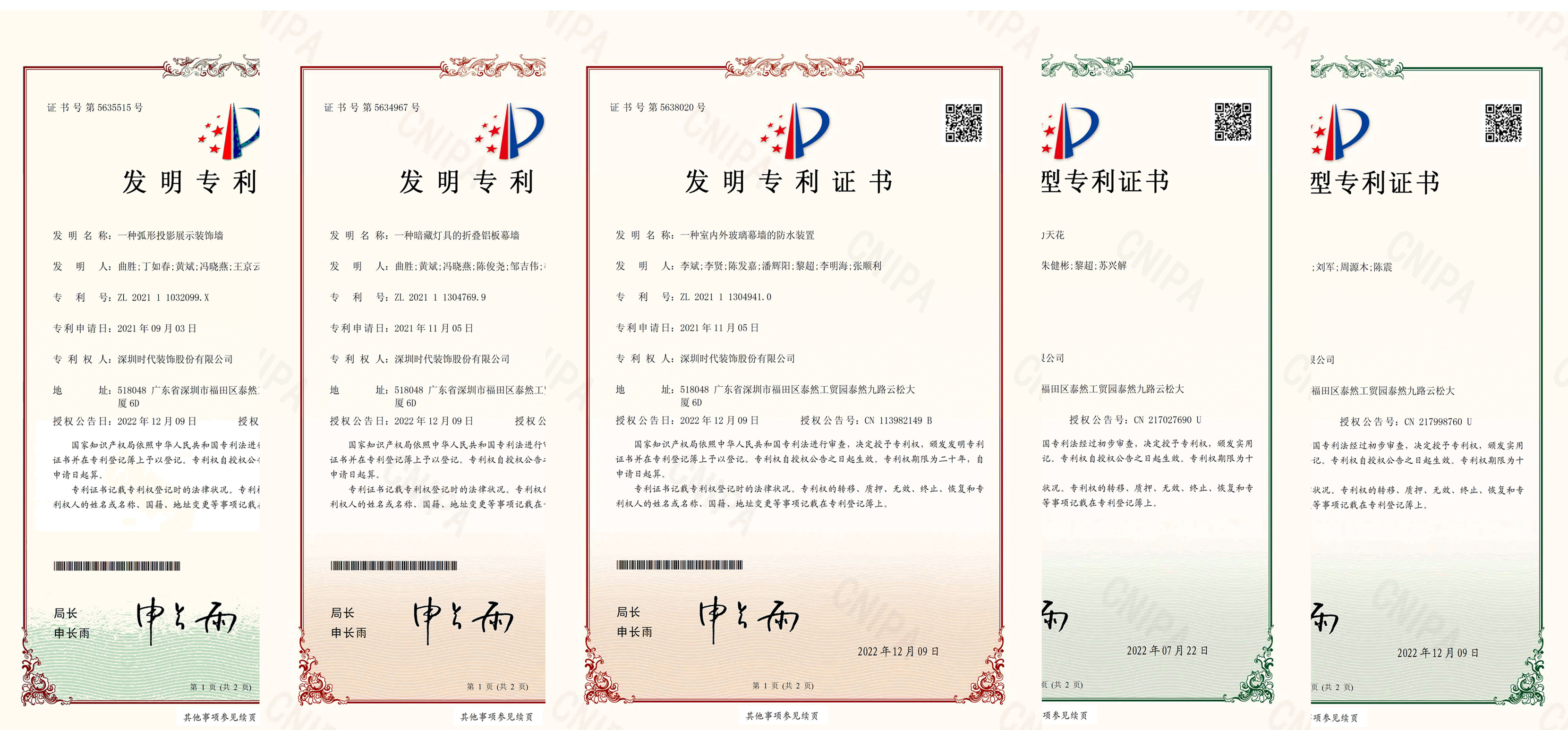 時(shí)代裝飾緊抓科技創(chuàng)新的關(guān)鍵,不斷開展裝飾領(lǐng)域技術(shù)及產(chǎn)品的研發(fā)與培育,以實(shí)現(xiàn)核心技術(shù)的突破與創(chuàng)新,促進(jìn)建筑裝飾領(lǐng)域技術(shù)的協(xié)同創(chuàng)新。2022年,我司在知識(shí)產(chǎn)權(quán)方面取得了突破性的進(jìn)展,自主研發(fā)并獲授權(quán)的專利共計(jì)38件,其中包括3件發(fā)明專利,35件實(shí)用新型專利,獲得軟件著作權(quán)6件,發(fā)表行業(yè)論文6篇,由我司參編的廣東省地方標(biāo)準(zhǔn)——《建筑室內(nèi)裝配式裝修技術(shù)規(guī)程》DBJ/T15-246-2022將于2023年7月1日起實(shí)施,同時(shí)由我司自主研發(fā)的“裝配式內(nèi)裝技術(shù)體系研發(fā)與產(chǎn)業(yè)化應(yīng)用”課題順利通過廣東省、深圳市科技計(jì)劃項(xiàng)目的中期考核。