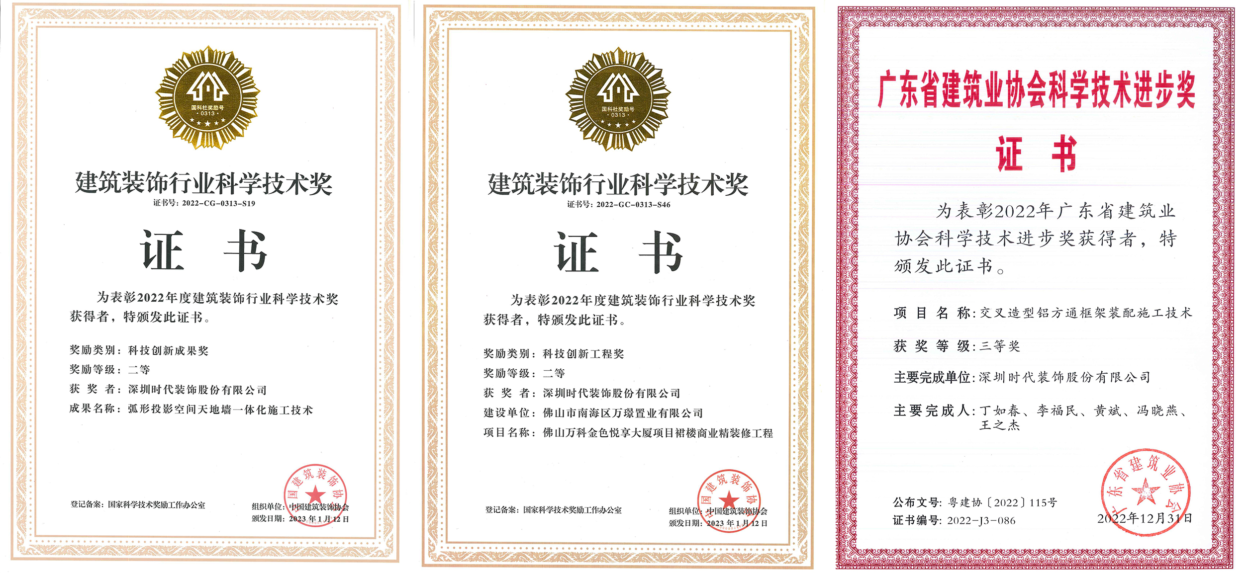 2022年,由我司承建的佛山萬科金色悅享大廈項(xiàng)目裙樓商業(yè)精裝修工程榮獲2022年度建筑裝飾行業(yè)科學(xué)技術(shù)獎(jiǎng)——科技創(chuàng)新工程獎(jiǎng);由我司自主研發(fā)的弧形投影空間天地墻一體化施工技術(shù)、交叉造型鋁方通框架裝配施工技術(shù)分別獲得2022年度建筑裝飾行業(yè)科學(xué)技術(shù)獎(jiǎng)——科技創(chuàng)新成果獎(jiǎng),2022年廣東省建筑業(yè)協(xié)會(huì)科學(xué)技術(shù)進(jìn)步獎(jiǎng)。