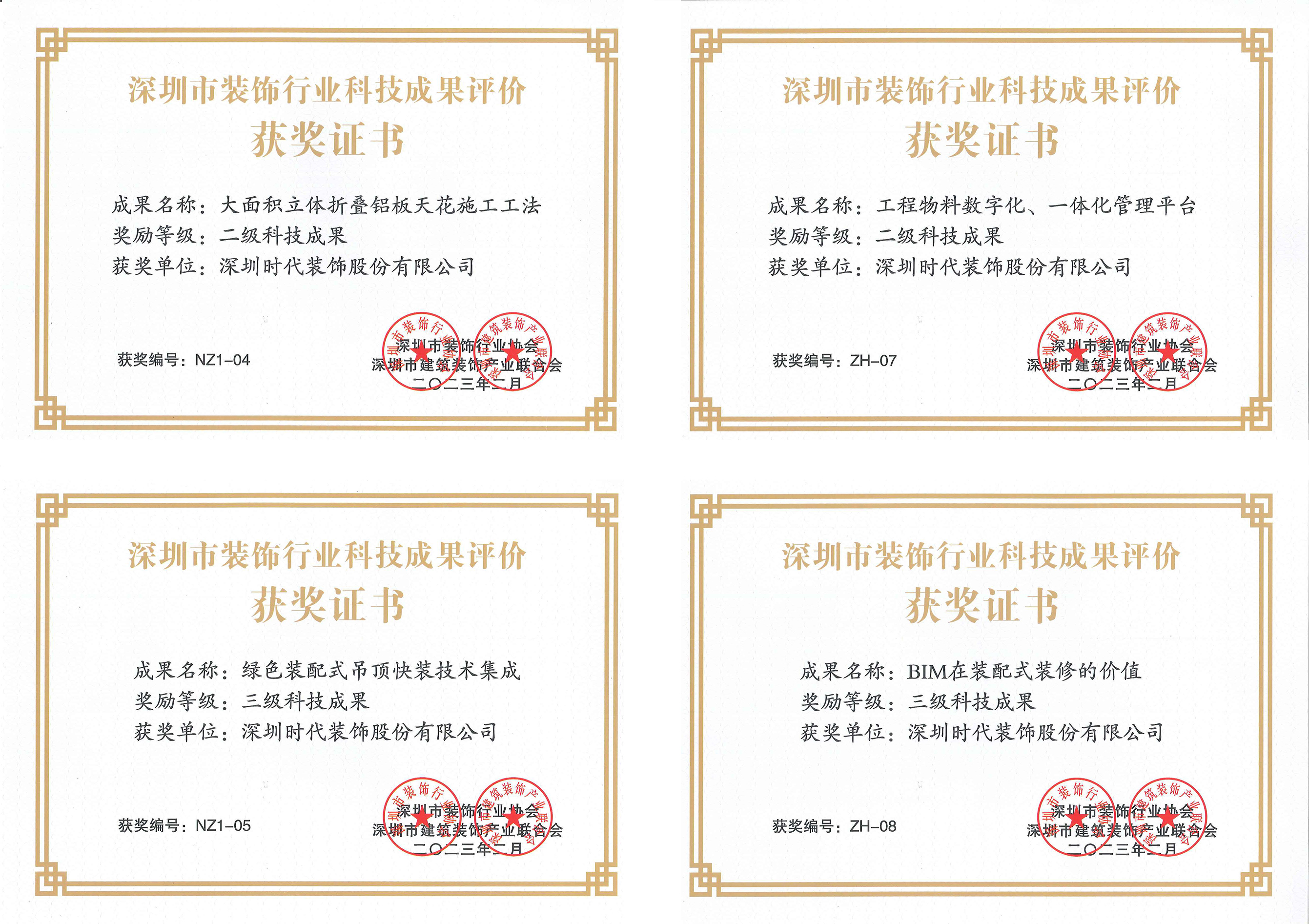 為促進(jìn)生產(chǎn)力發(fā)展水平提升,推動(dòng)裝飾行業(yè)高質(zhì)量發(fā)展,深圳市裝飾行業(yè)協(xié)會(huì)開展了深圳裝飾行業(yè)科技成果評(píng)價(jià)和推廣工作,并組織專家對(duì)成果項(xiàng)目進(jìn)行評(píng)審評(píng)價(jià),最終共76項(xiàng)成果獲評(píng),我司共計(jì)4項(xiàng)成果上榜。