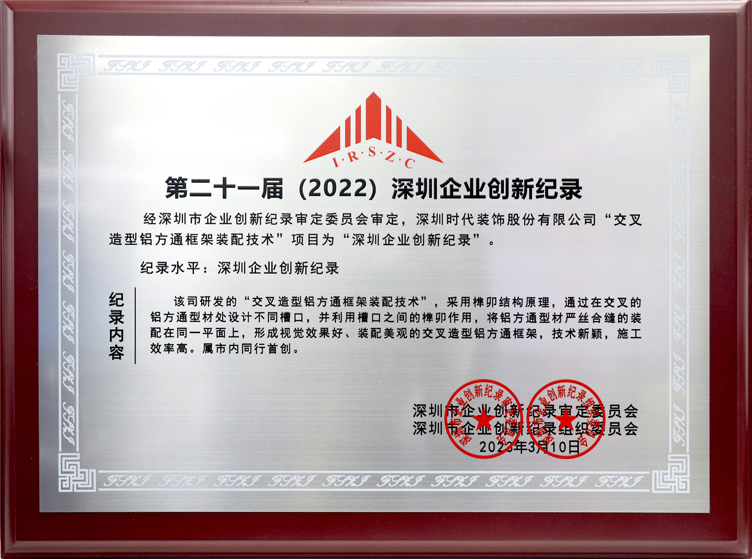 第二十一屆“深圳企業(yè)創(chuàng)新紀(jì)錄”審定會(huì)議成功召開,經(jīng)深圳市企業(yè)創(chuàng)新紀(jì)錄審定委員會(huì)委員認(rèn)真審議,最終審定通過151家企業(yè)的205個(gè)項(xiàng)目為第二十一屆“深圳企業(yè)創(chuàng)新紀(jì)錄”。其中,由我司自主研發(fā)的“交叉造型鋁方通框架裝配技術(shù)”成功獲評(píng)。目前該技術(shù)已在我司承建的華潤(rùn)萬象食家等多個(gè)項(xiàng)目成功實(shí)施,屬于市內(nèi)同行首創(chuàng)。