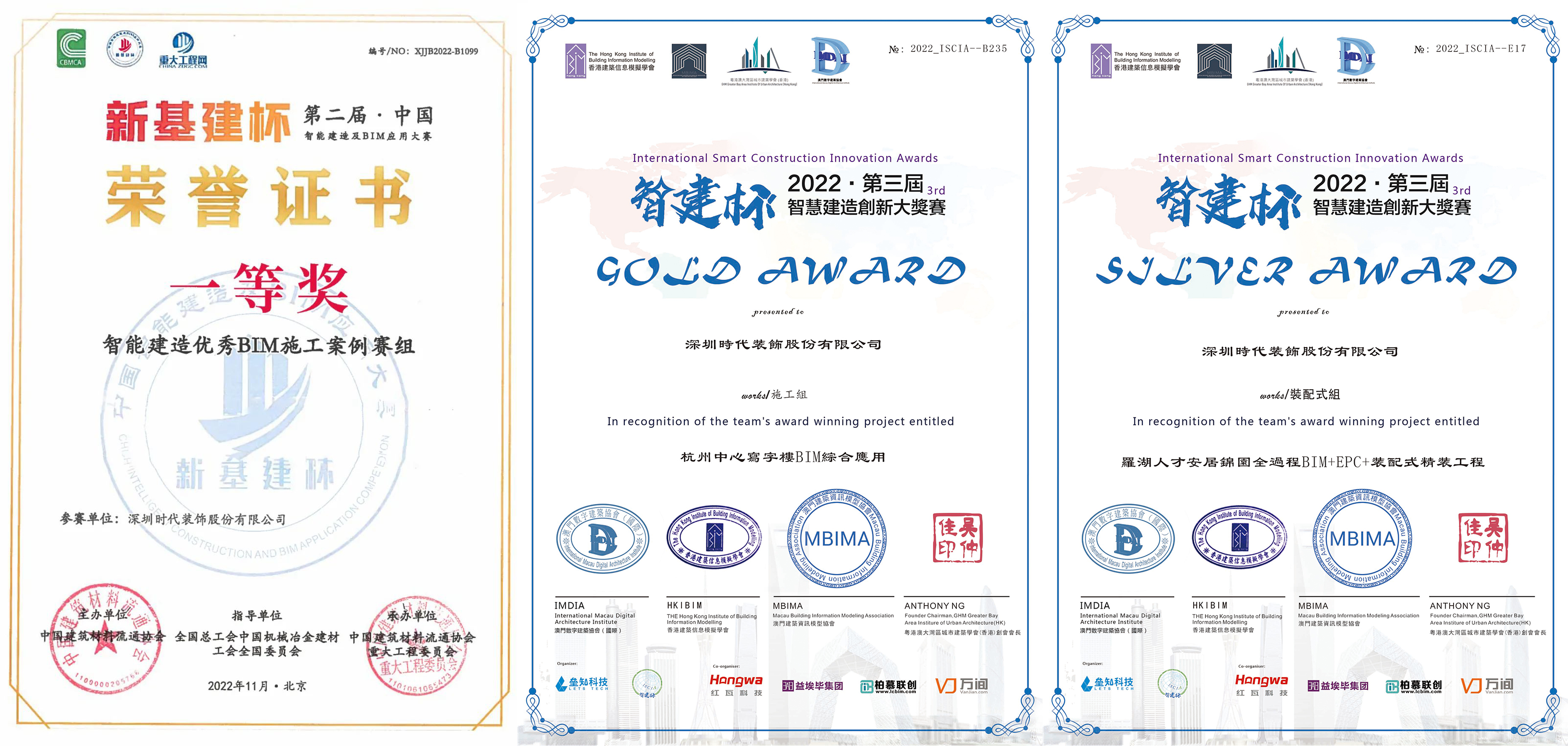 BIM技術(shù)在建筑行業(yè)內(nèi)的普及與廣泛應(yīng)用,為行業(yè)的發(fā)展帶來了巨大效益。我司作為建筑裝飾企業(yè)堅(jiān)持BIM技術(shù)的研發(fā)與應(yīng)用,積累了豐富的BIM技術(shù)實(shí)施應(yīng)用經(jīng)驗(yàn),并形成成熟的BIM技術(shù)應(yīng)用體系。在2022年,我司在由中國(guó)建筑材料流通協(xié)會(huì)主辦第二屆“新基建杯”中國(guó)智能建造及BIM應(yīng)用大賽與澳門數(shù)字建造協(xié)會(huì)(國(guó)際)舉辦的第三屆“智建杯”智慧建造創(chuàng)新大賽中分別獲得一等獎(jiǎng)、金、銀獎(jiǎng)以及數(shù)字建造最具影響力品牌企業(yè)獎(jiǎng)等多項(xiàng)BIM大賽獎(jiǎng)項(xiàng)。