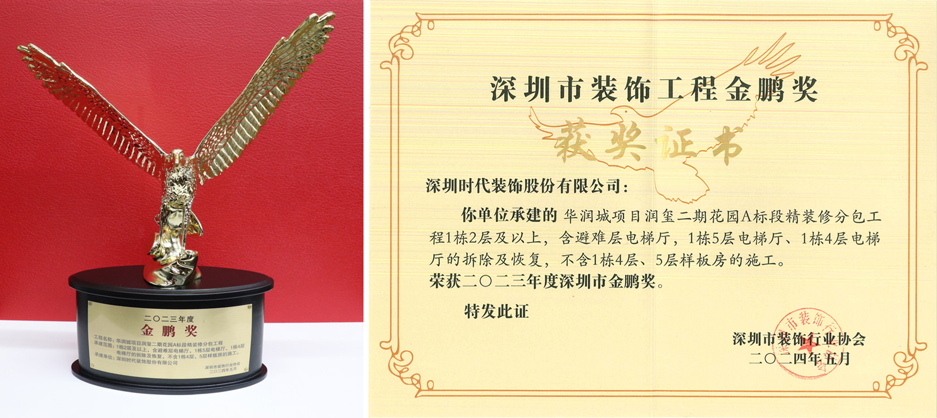 此次榮獲“2023年度深圳市裝飾工程金鵬獎”殊榮,榮耀背后,是時代裝飾對“細節(jié)決定品質(zhì)”的不懈追求與生動實踐。